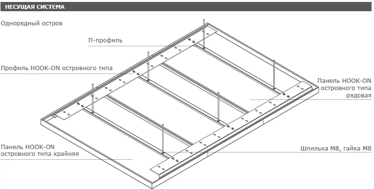 Потолок остров НООK-ON система HI-100 представляет собой готовое потолочное решение модульного типа. Потолок собран из панелей с креплением HOOK-ON на скрытой подвесной системе.